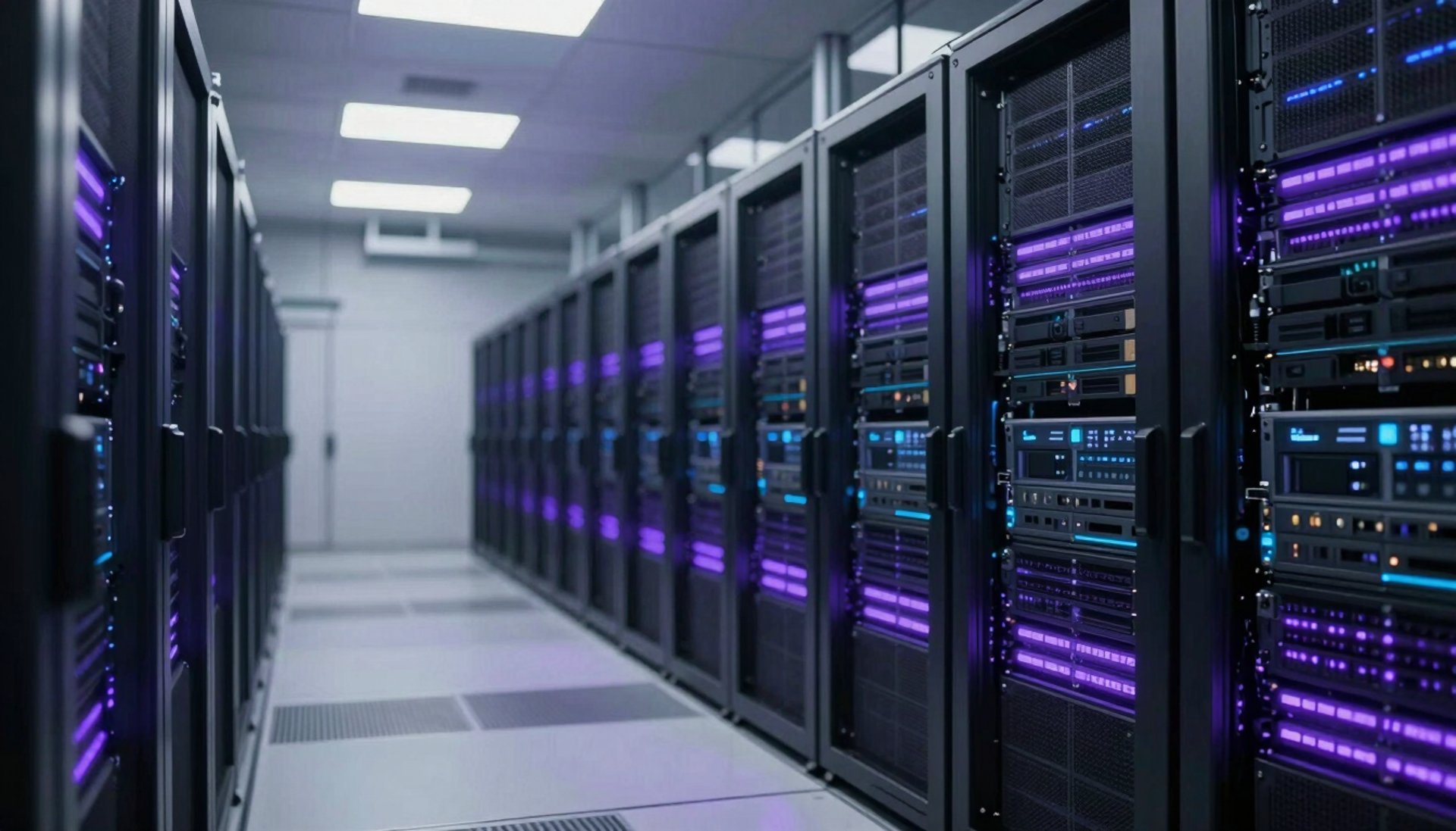 A blurred view of a developer working on a multi-monitor setup in a stylish tech office, North American / International, purple ambient lighting.